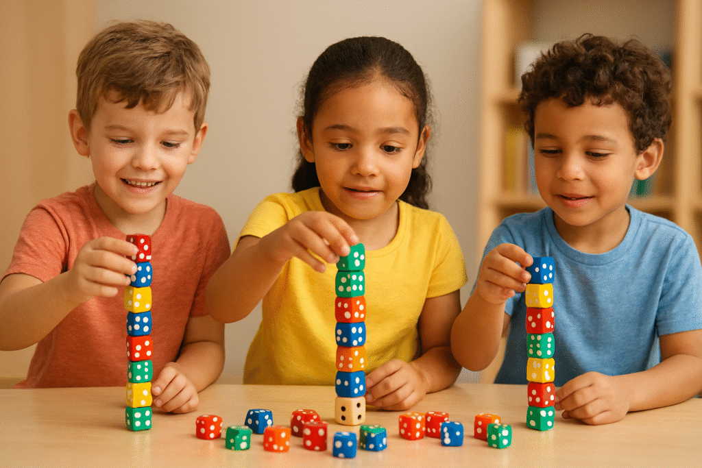 When children eventually sit down with paper and pencil, they’re not starting from scratch. They’re connecting abstract symbols to concrete experiences they’ve had with dice, cards, blocks, and movement.